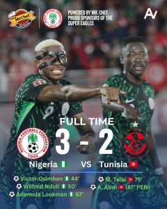 The Nigeria Super Eagles have qualified for the round of 16; knockout stage of the 2025 Africa Cup of Nations in Morocco, after beating Tunisia 3–2 on Saturday night.